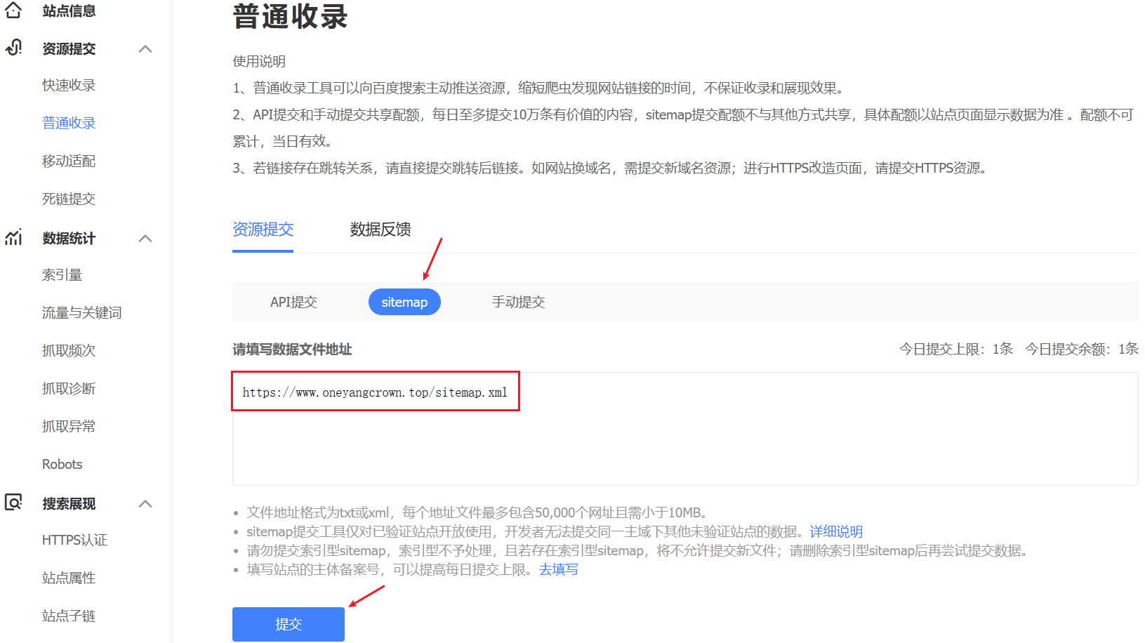 打开 普通收录>资源提交>sitemap,输入你站点地图的访问链接,然后点提交
