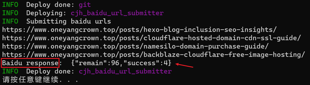 执行顺利的话可以接收到百度返回的消息,如上图所示,这里success成功推送的url条数有4条,remain当天剩余的可推送url条数为96条