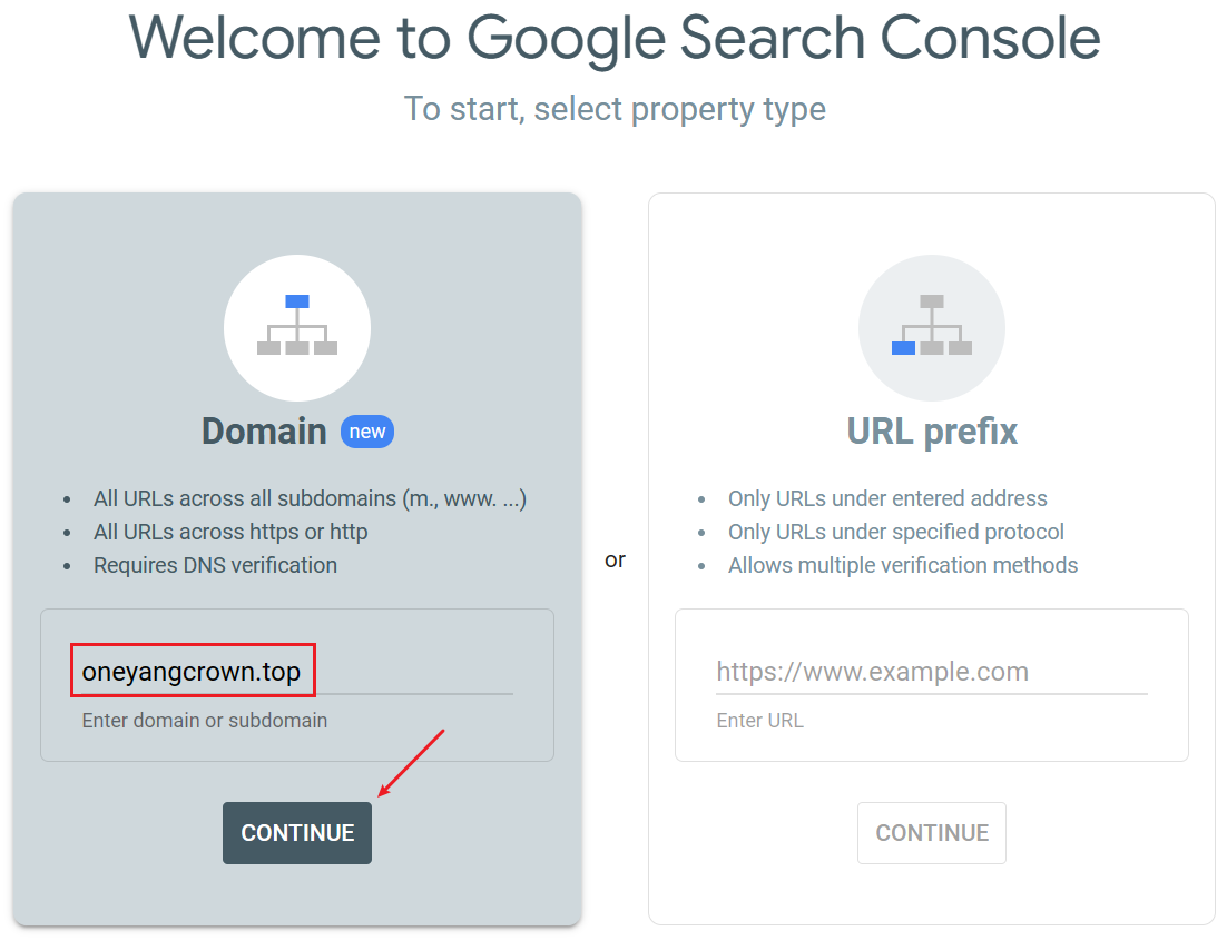 选择Domain,输入你购买的域名,点CONTINUE继续: