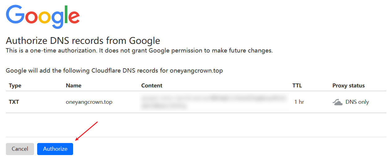 登陆Cloudflare账号,点击Authorize授权,就可以自动添加DNS记录到Cloudflare