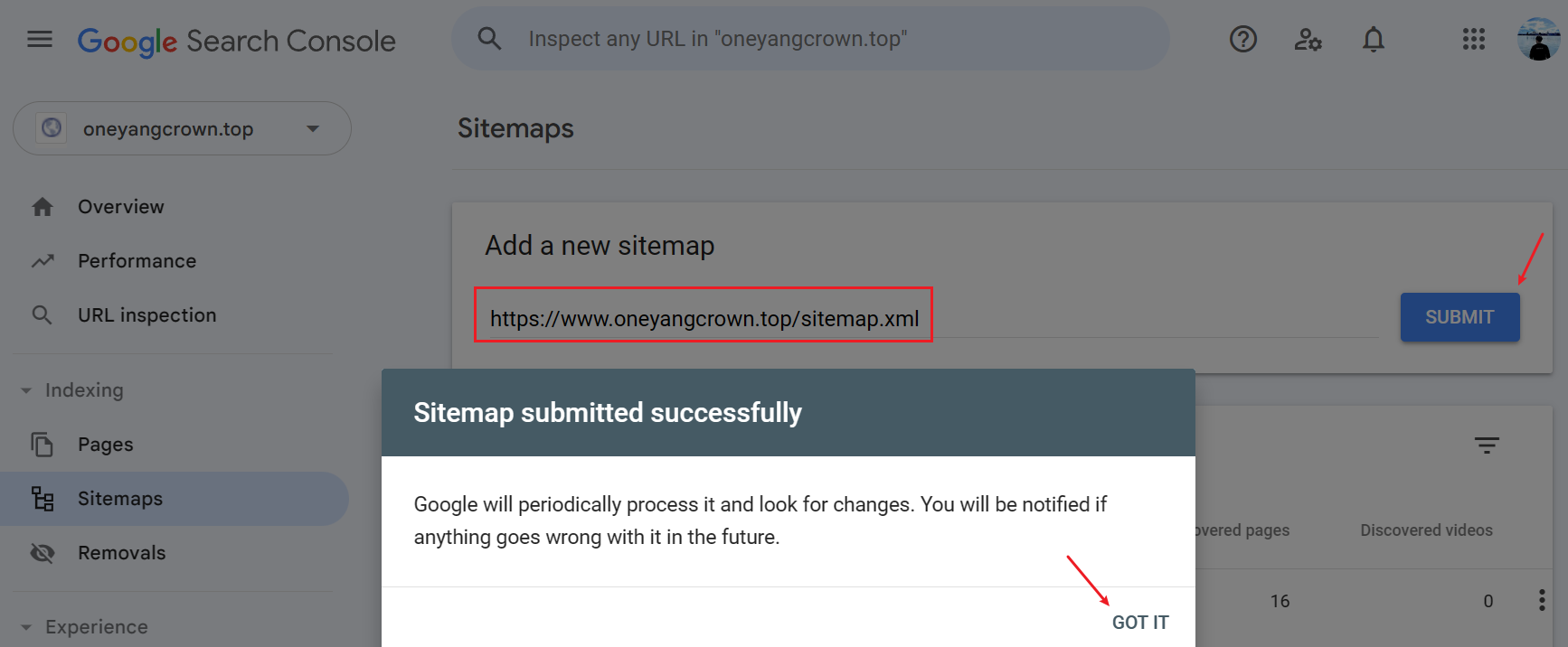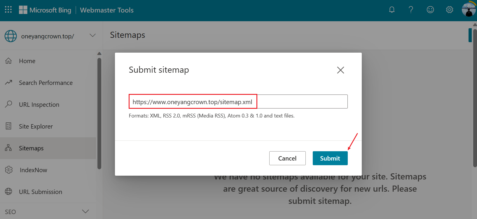 点击左侧菜单栏Sitemaps,输入你站点地图的访问链接,然后点Submit提交