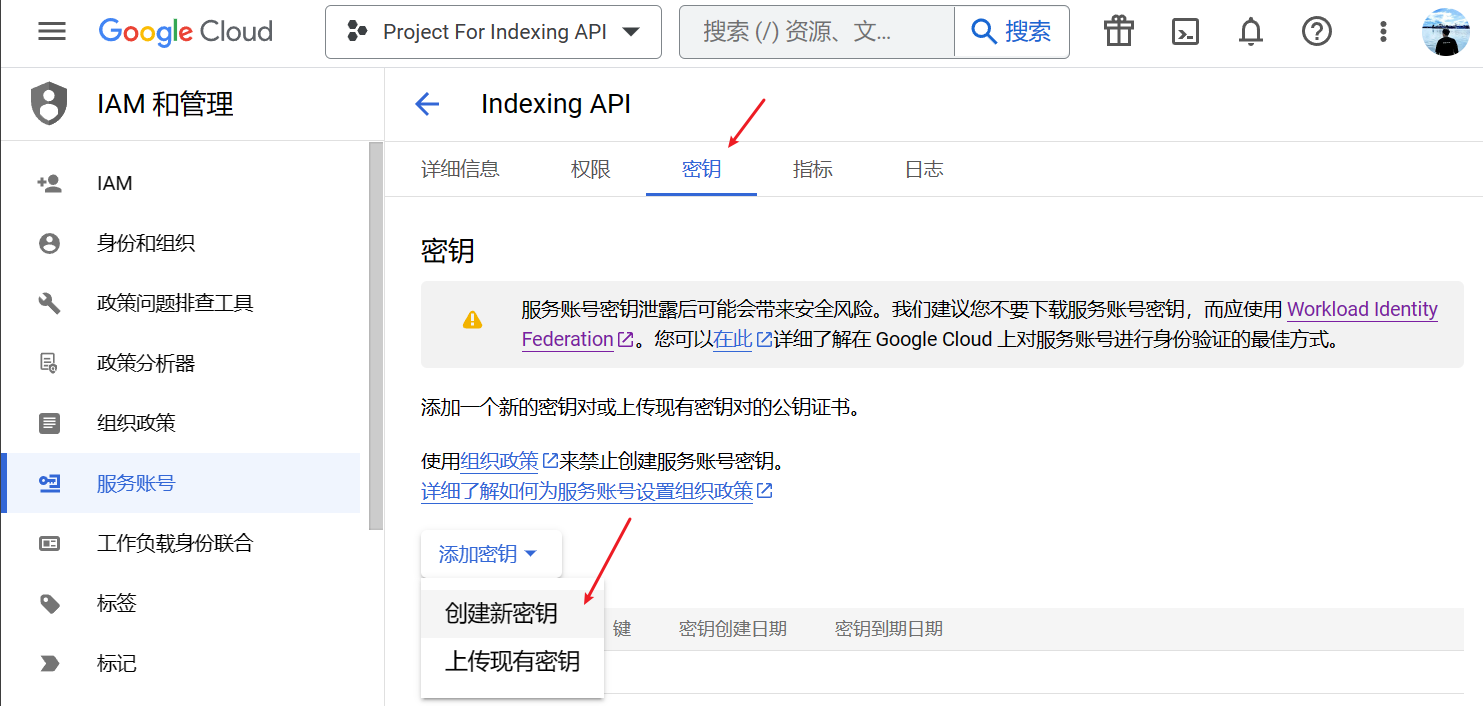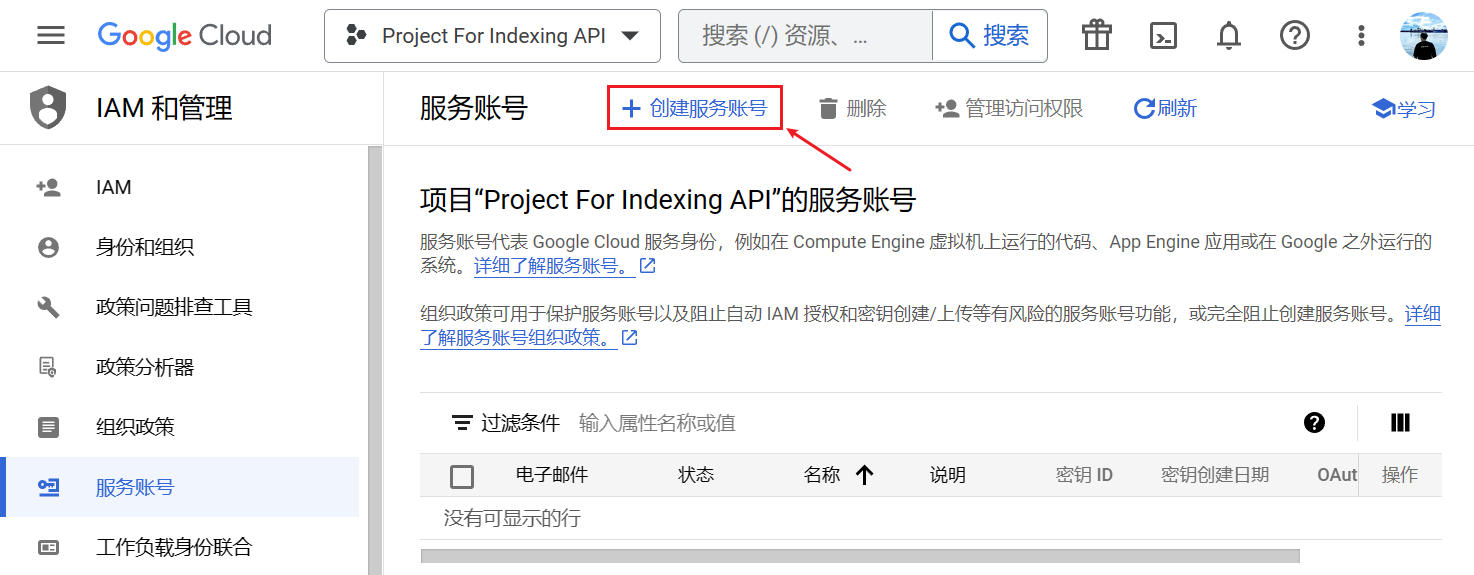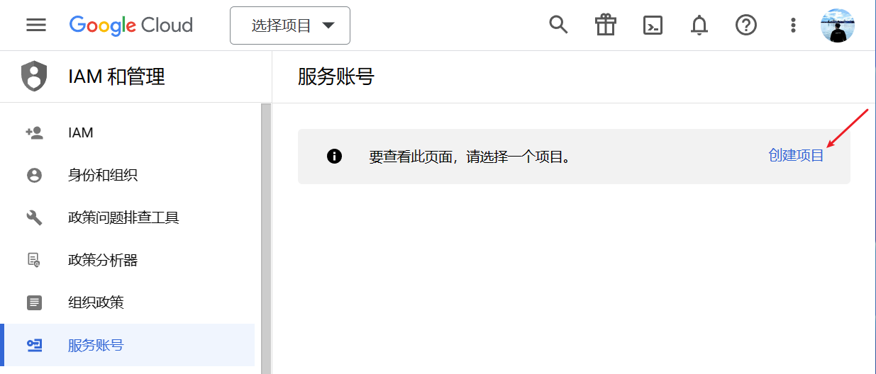 打开Google Cloud服务帐号页面,没有项目的话需要先创建一个: