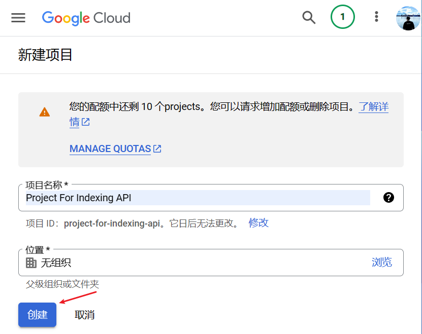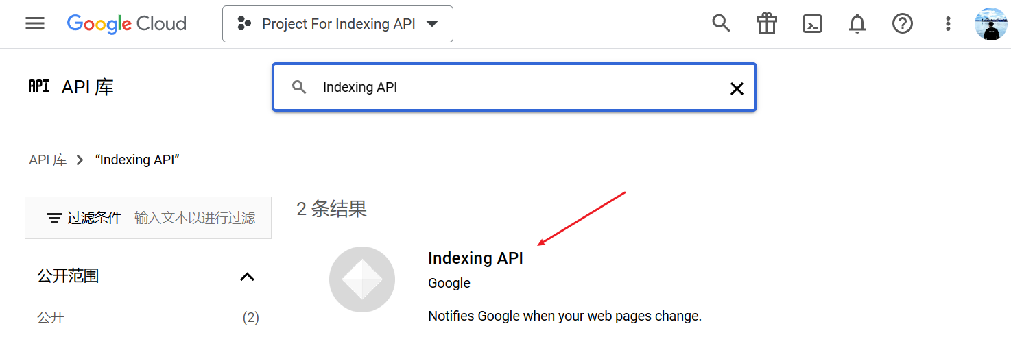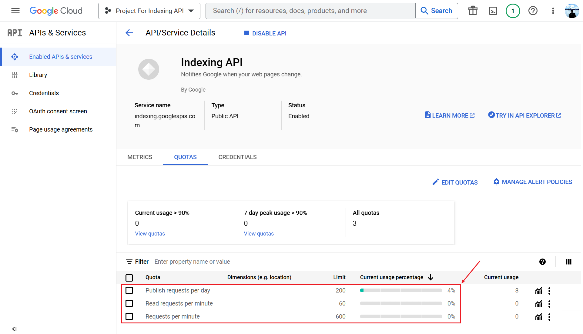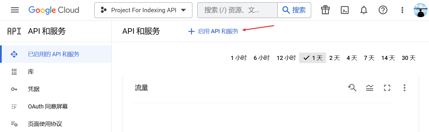 在API 和服务页面可以看到Indexing API额度的使用情况