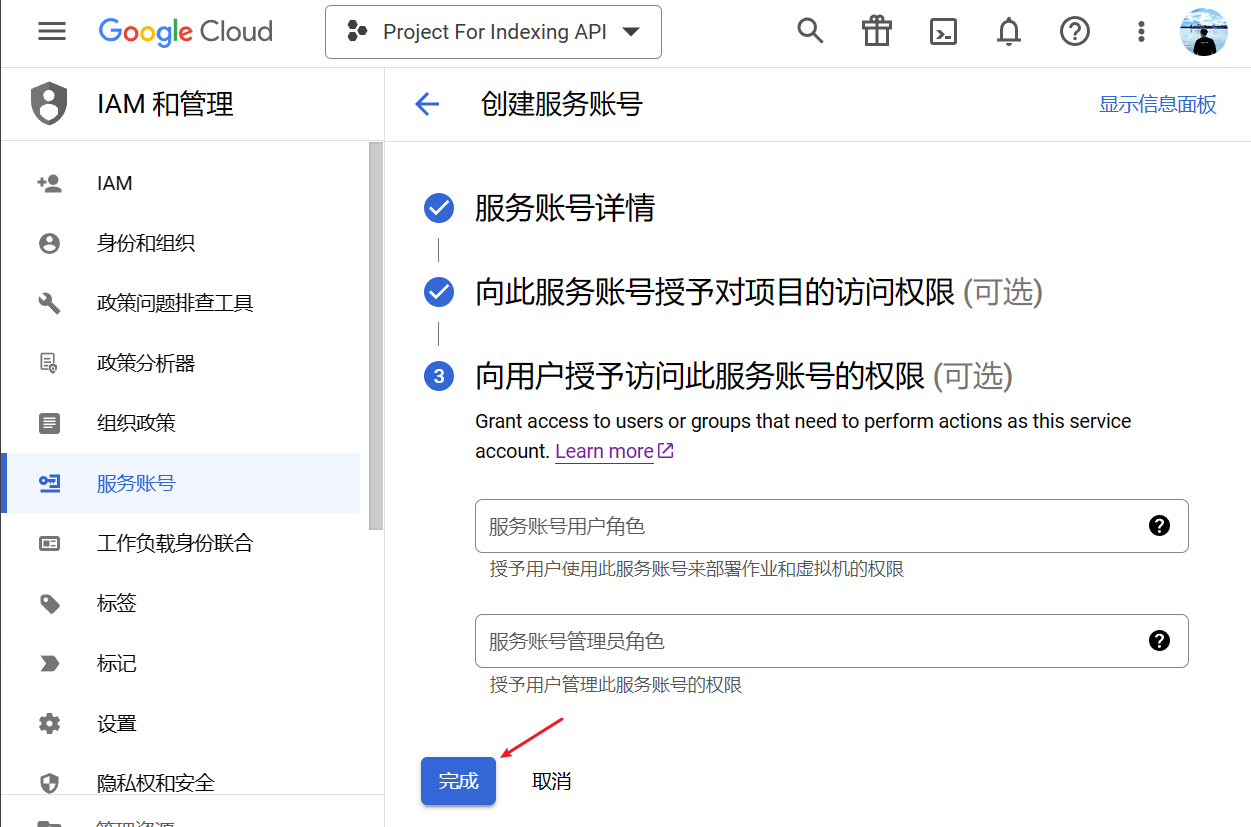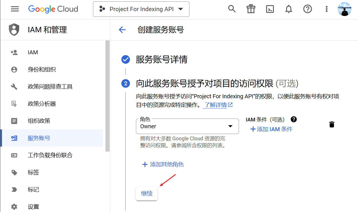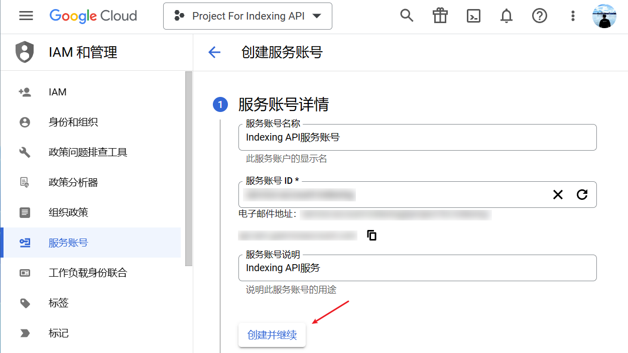 填写三项信息,服务账号ID可以随机生成,然后点创建并继续