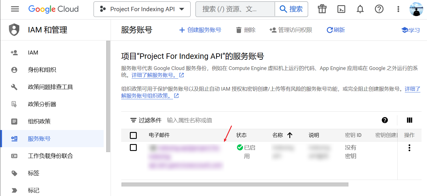- 先把该服务账号的邮箱地址复制并保存,后续要用到
