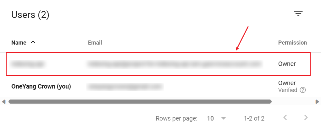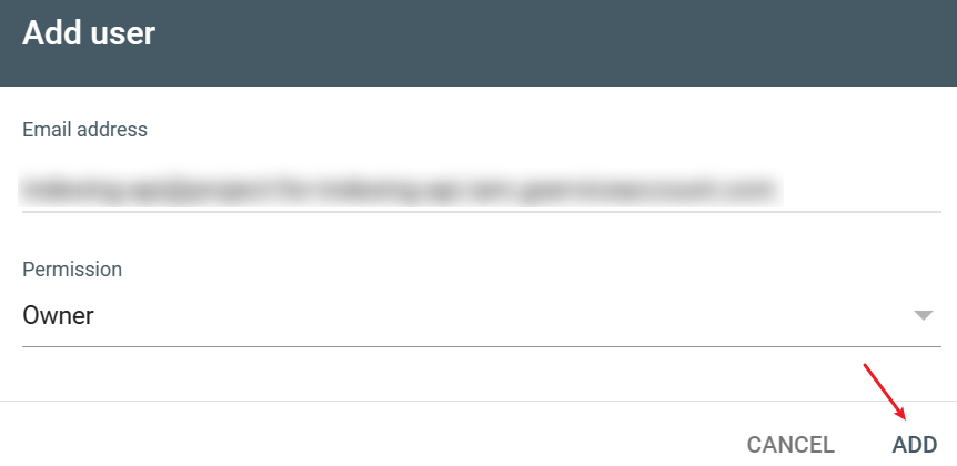 填入前面服务账号的邮箱地址,设置为Owner所有者,点击ADD添加