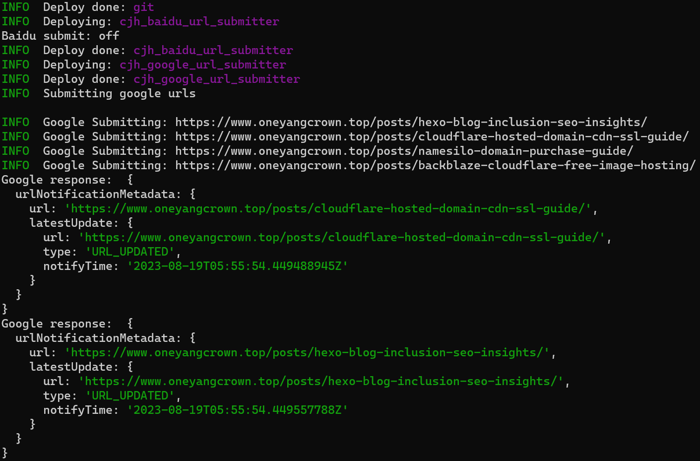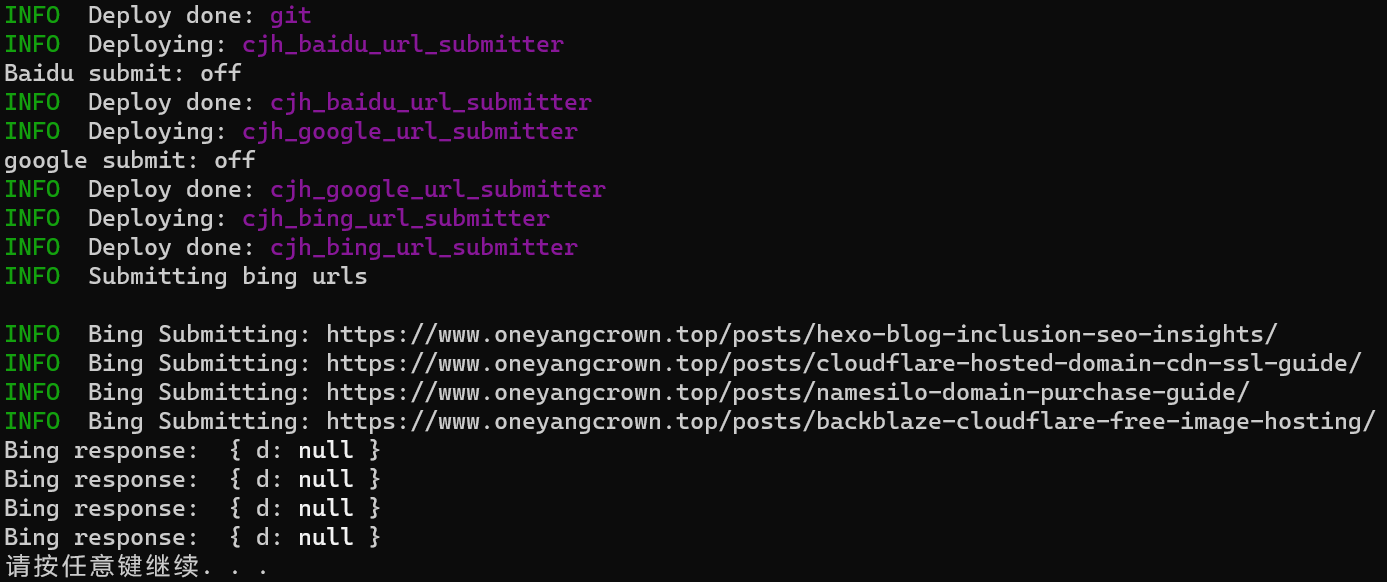 我们可以使用hexo-submit-urls-to-search-engine这个插件,可以自动向百度、谷歌、必应三大平台推送我们博客的新链接。