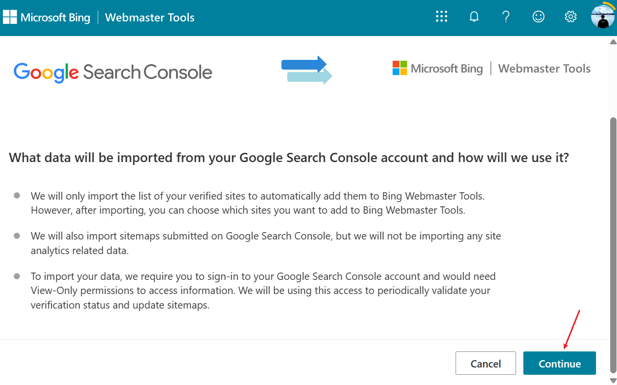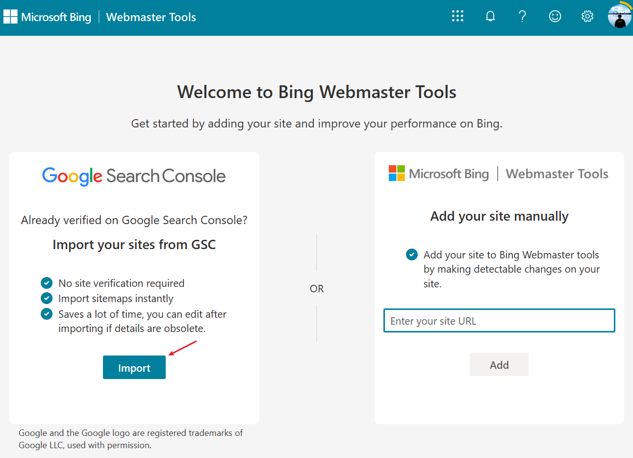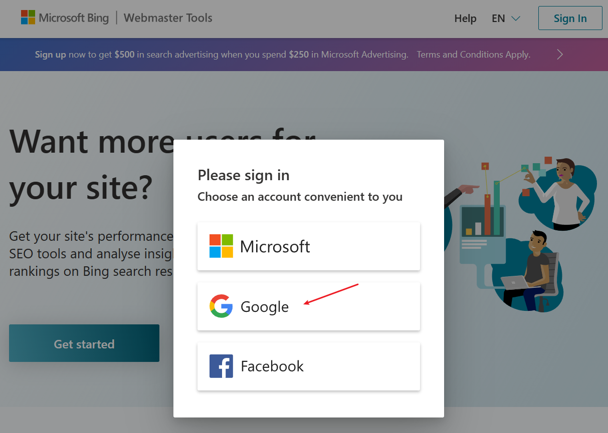 打开必应站长平台,这里直接用前面绑定了谷歌站长平台的谷歌账号登陆