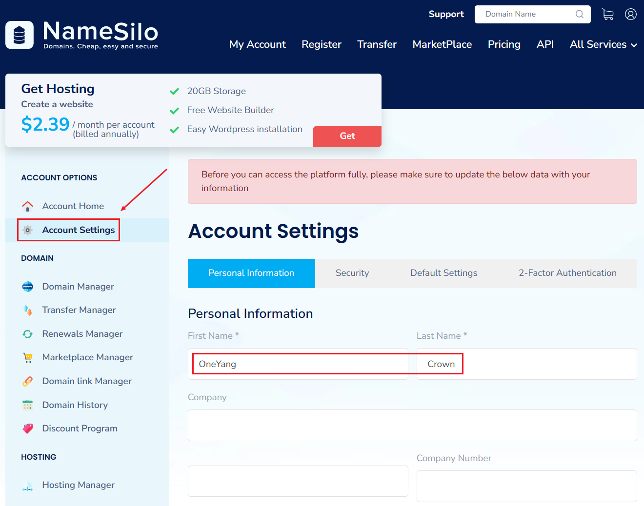 NameSilo要求设置相关信息后,才能完全访问域名控制台,信息不要求真实性