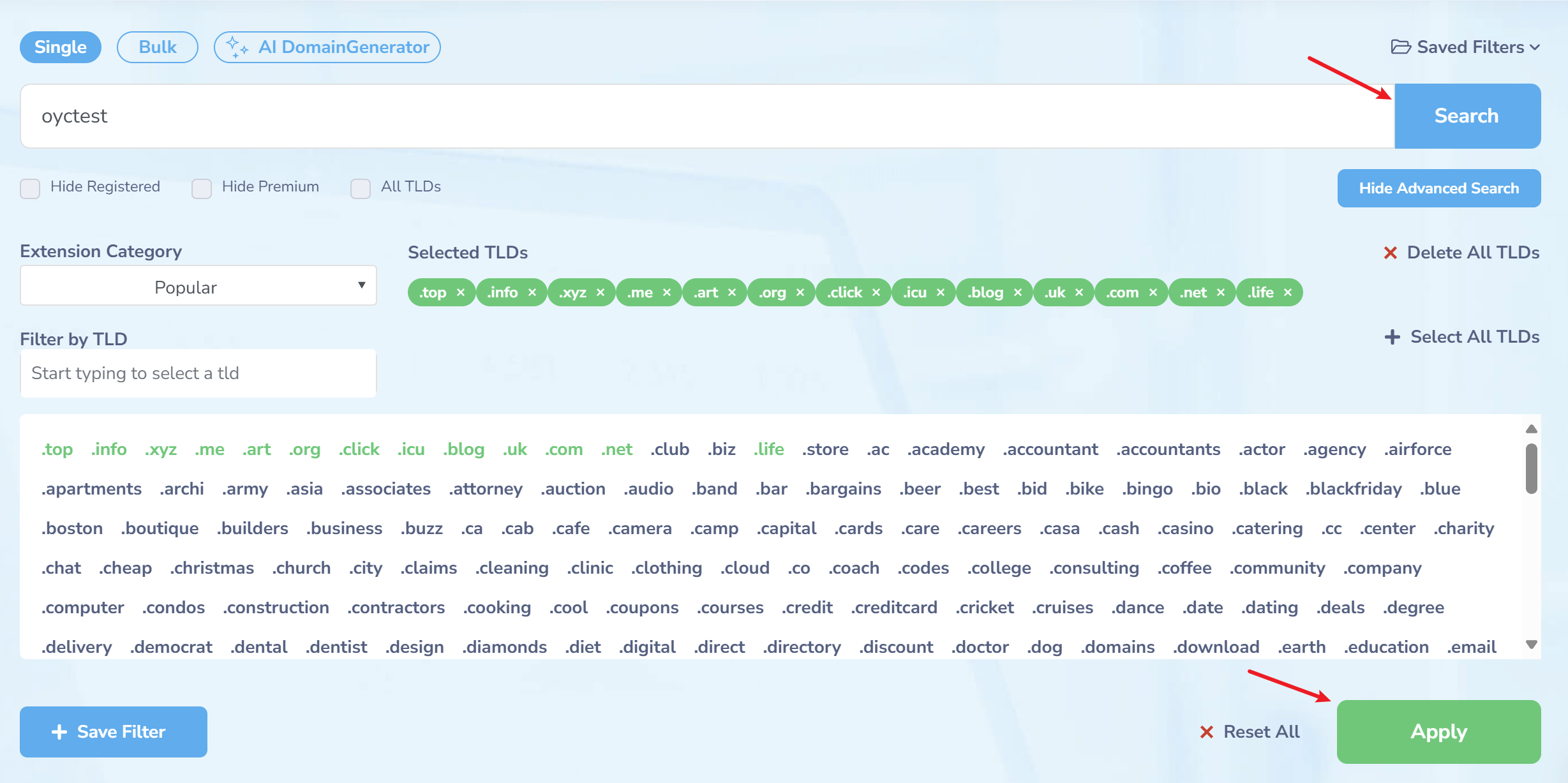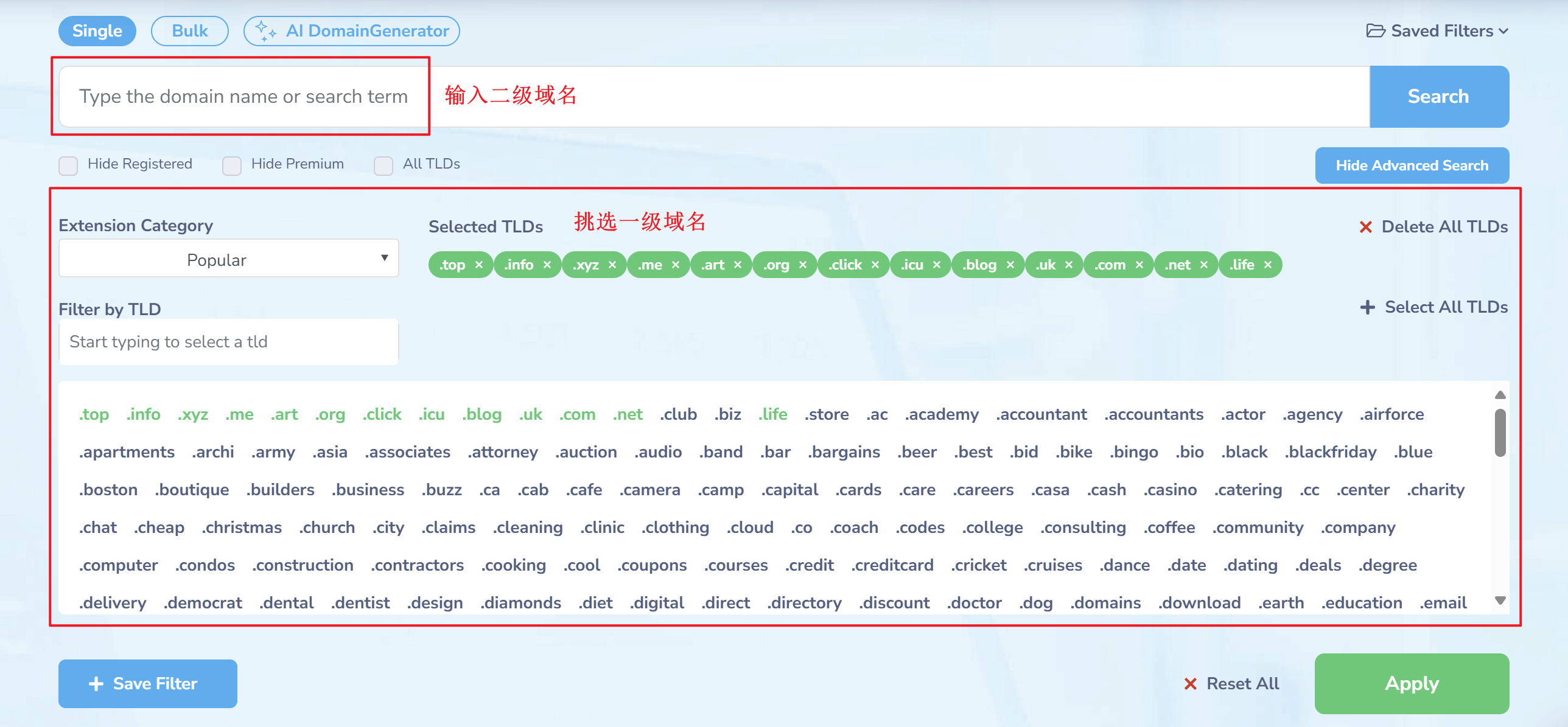在输入框中填入你想好的二级域名,并筛选喜欢的一级域名