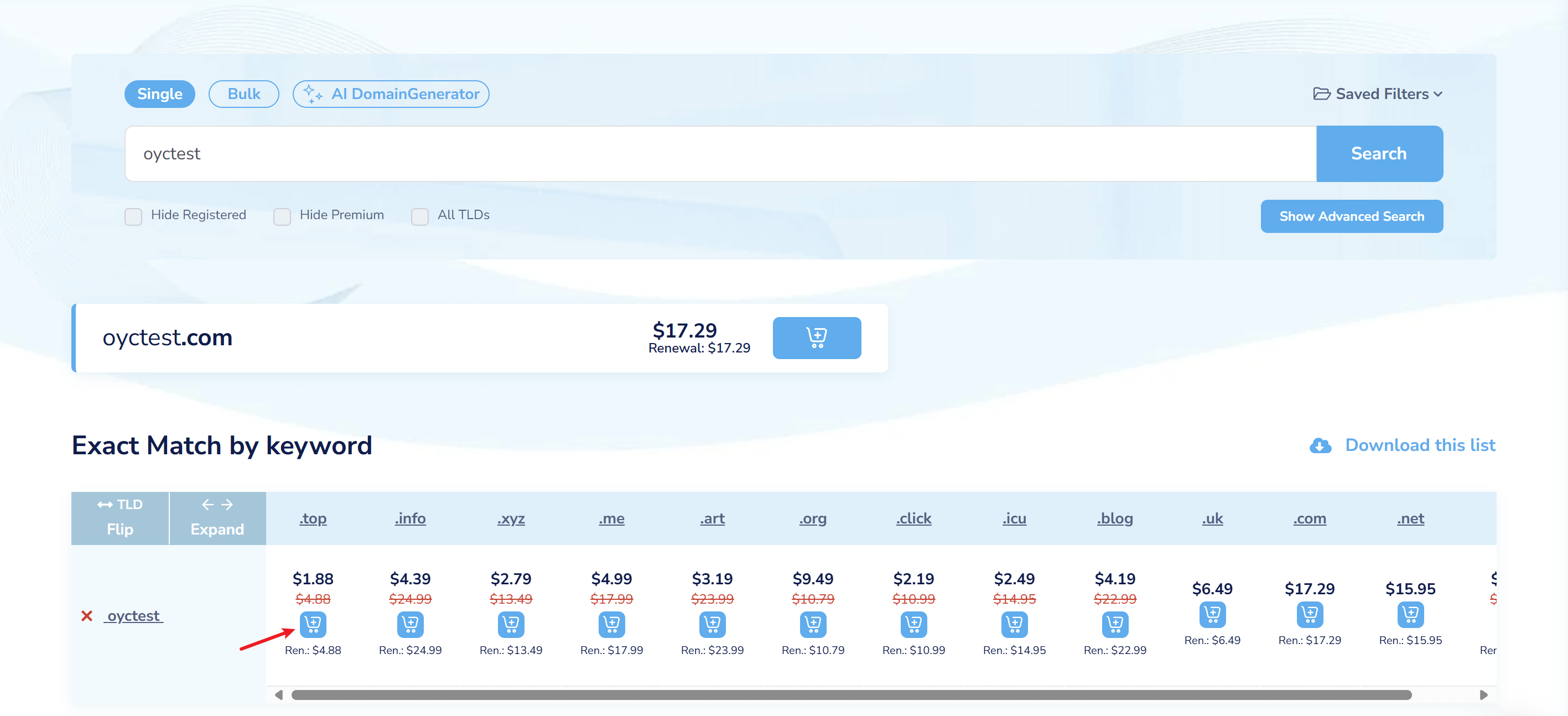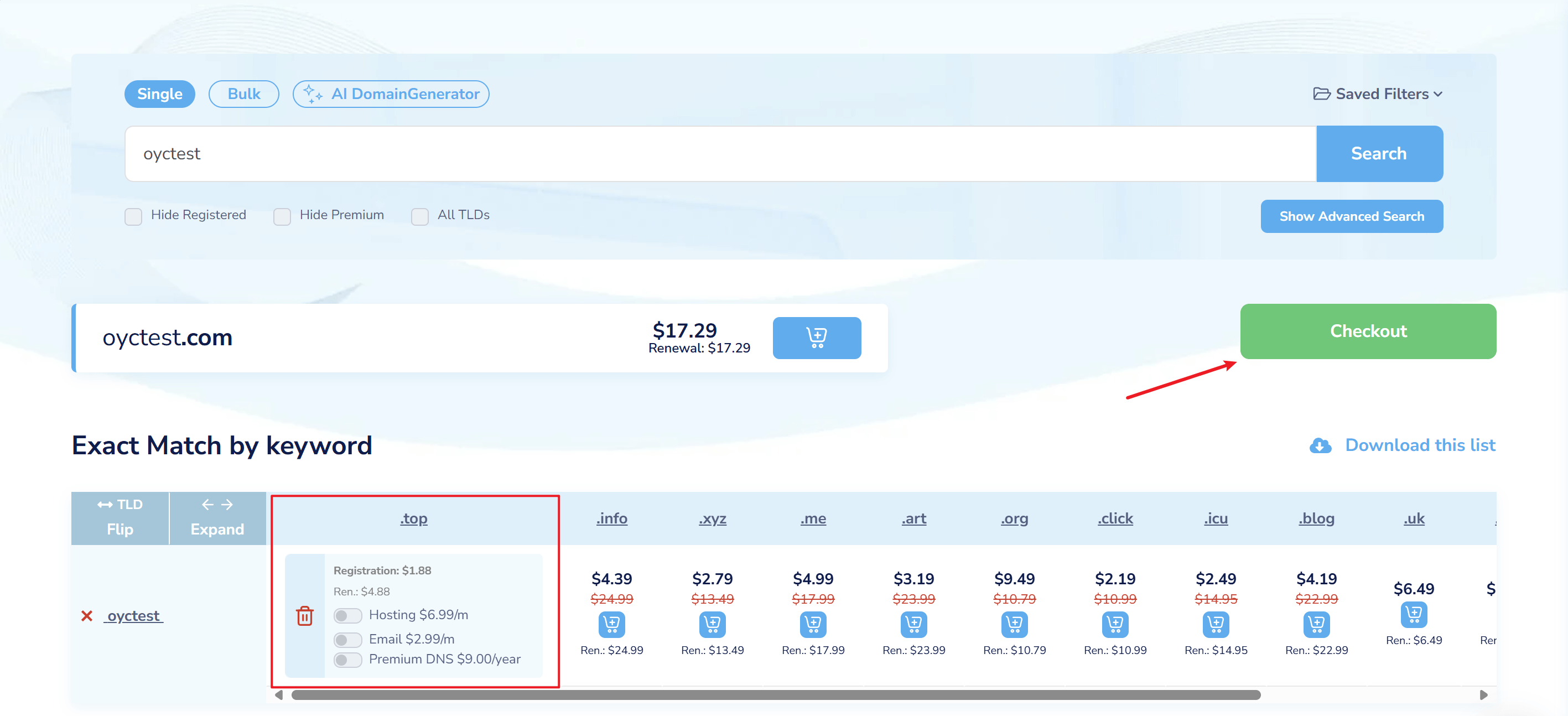 可以看到下图这个.top域名首年优惠价格是1.88美金(人民币约13元)