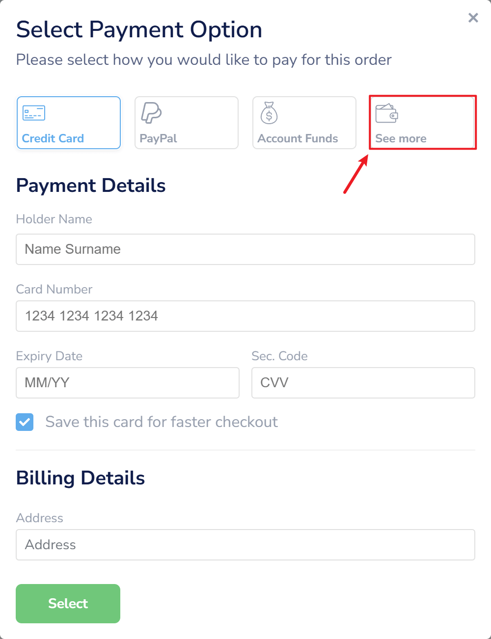 这里会自动弹出付款方式选项页面,支持信用卡、PayPal等方式,可以点击See more查看更多付款方式