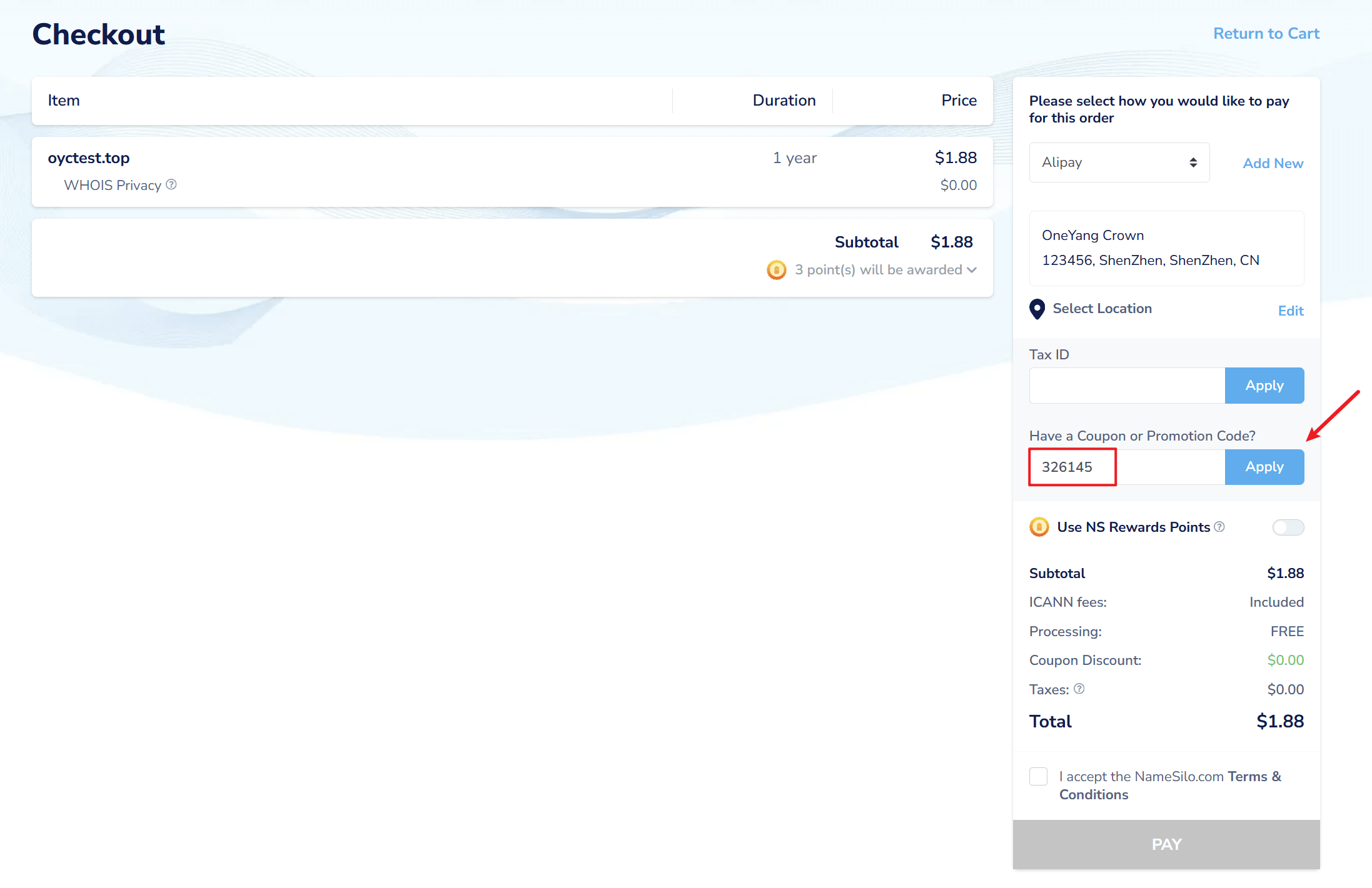 点击Renew可以进行手动续费,续费和购买流程差不多,同样也可以使用优惠码