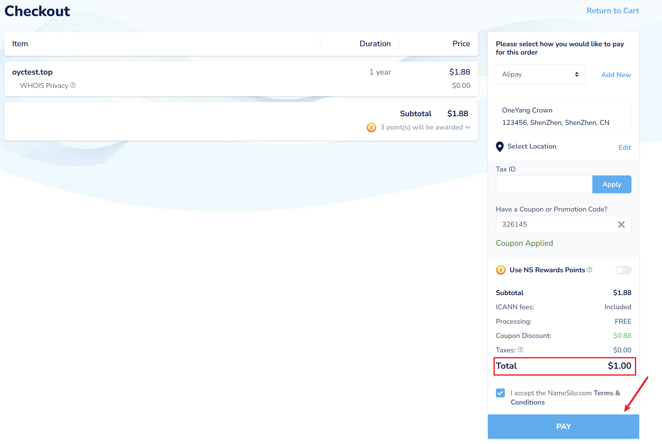 最后,勾选同意条款和条件复选框,再点击PAY支付