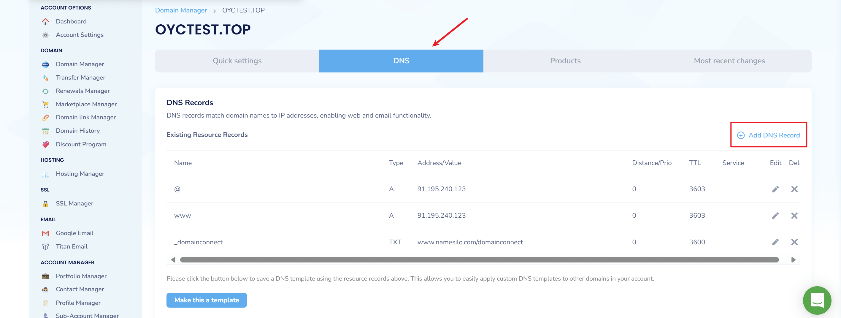 在域名设置页面中,点击DNS选项,这里可以管理所有DNS记录