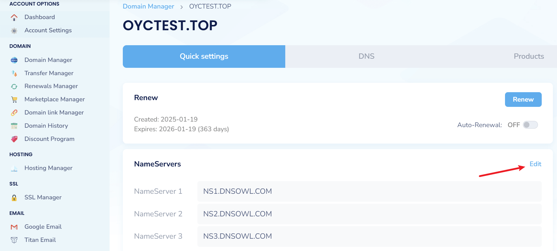 在域名设置页面中,找到NameServers选项,点击Edit编辑